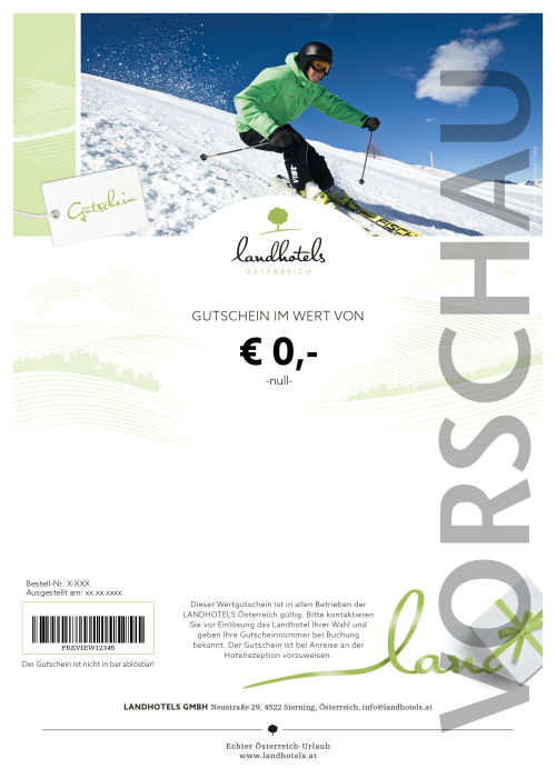 Dieser LANDHOTELS Wertgutschein ist mein Beitrag zu Deinem wohlverdienten Urlaubsglück: Ich schenke Dir „Echten Österreich-Urlaub“! Suche Dir einfach eines der LANDHOTELS Österreich aus - und genieße eine glückliche, erholsame Zeit am Land.